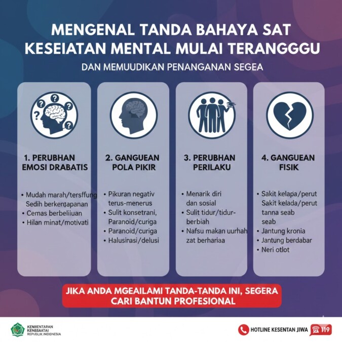 Kesehatan mental memiliki peran yang sangat penting dalam menjaga kualitas hidup seseorang. Sayangnya, banyak orang masih mengabaikan kondisi mental hingga gangguan yang dialami berkembang menjadi lebih serius. Kurangnya pemahaman mengenai tanda bahaya kesehatan mental sering membuat seseorang terlambat mendapatkan bantuan. Oleh karena itu, mengenali gejala awal ketika kesehatan mental mulai terganggu menjadi langkah penting agar penanganan dapat dilakukan secepat mungkin dan dampak buruk bisa dicegah.