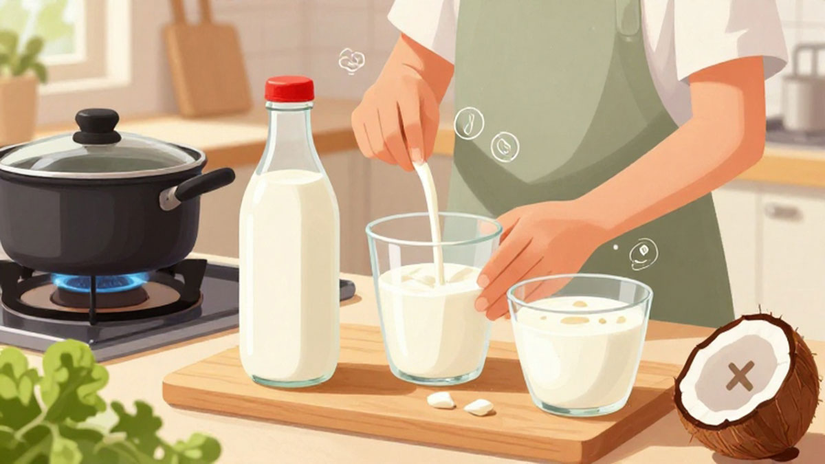 Salah satu cara mengganti santan adalah dengan menggunakan susu nabati seperti susu almond, susu kedelai, atau susu oat. Susu nabati memiliki kandungan lemak lebih rendah dibanding santan dan mengandung nutrisi tambahan seperti vitamin E dan kalsium. Untuk mendapatkan tekstur mirip santan, Anda bisa mencampur susu nabati dengan sedikit minyak kelapa atau tepung jagung sebagai pengental. Cara ini sangat cocok untuk masakan berkuah, kari, atau sup agar tetap creamy tanpa menambah lemak jenuh berlebih.